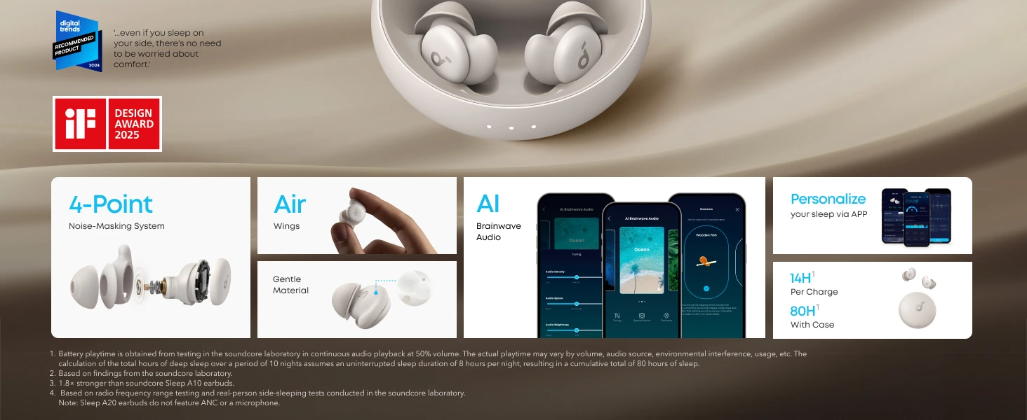 • Ultra-Comfort for Side Sleepers: Utilizing ultra-soft materials, soundcore's Air Wing, and a 3D ergonomic design, Sleep A20 earbuds ensure pressureless comfort all night long even for side sleeping.