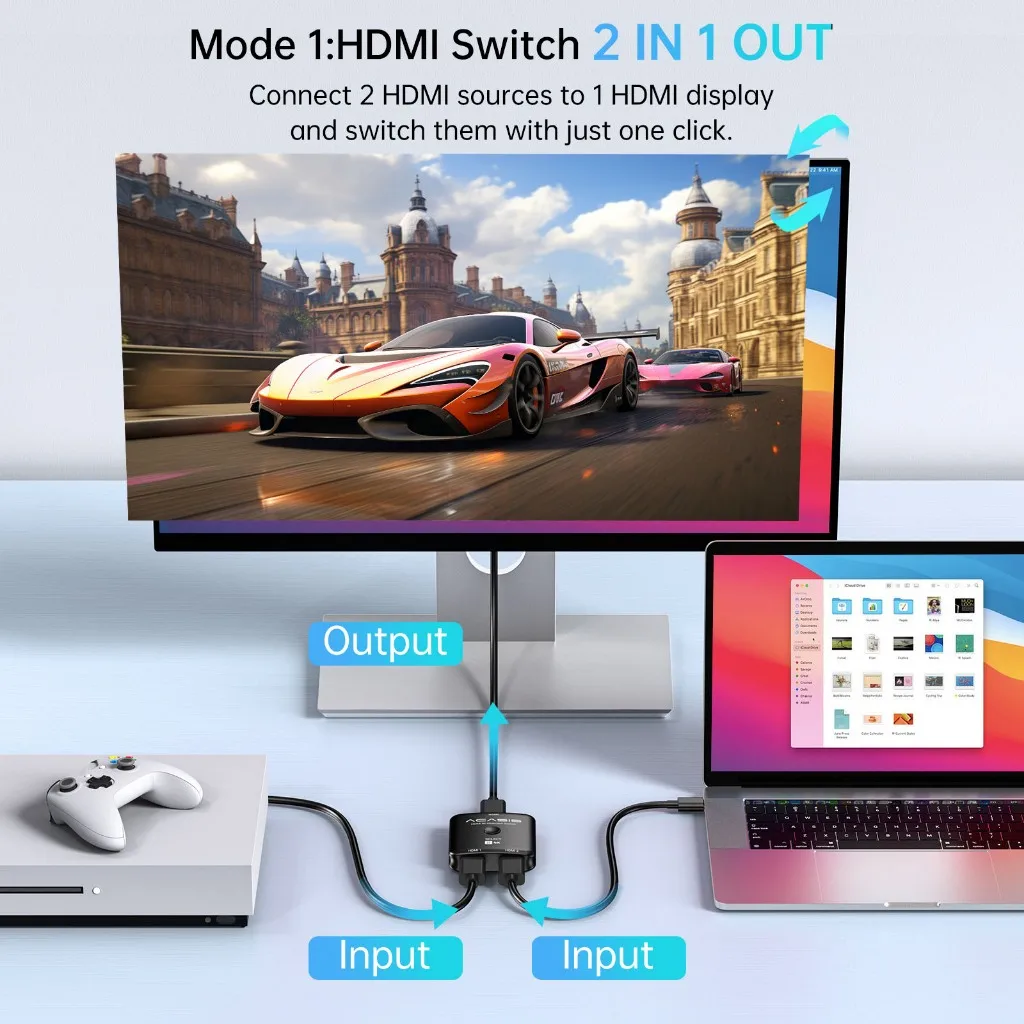 【Bidirectional HDMI 2.0 Switcher】This HDMI switch help you connect two HDMI sources to one HDMI display (2 IN 1 OUT), or connect one HDMI source to toggle between two displays(1 IN 2 OUT) ,Takes up minimal space on your desk and eliminates the clutter of multiple HDMI cables and devices. ✅ IT DOES NOT SUPPORT TWO SCREENS AT ONCE.