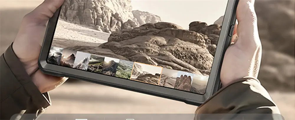 Functional pop out kickstand allows 45° viewing mode and 30 ° work mode. Built-in screen protector prevents scratches without compromising sensitivity.