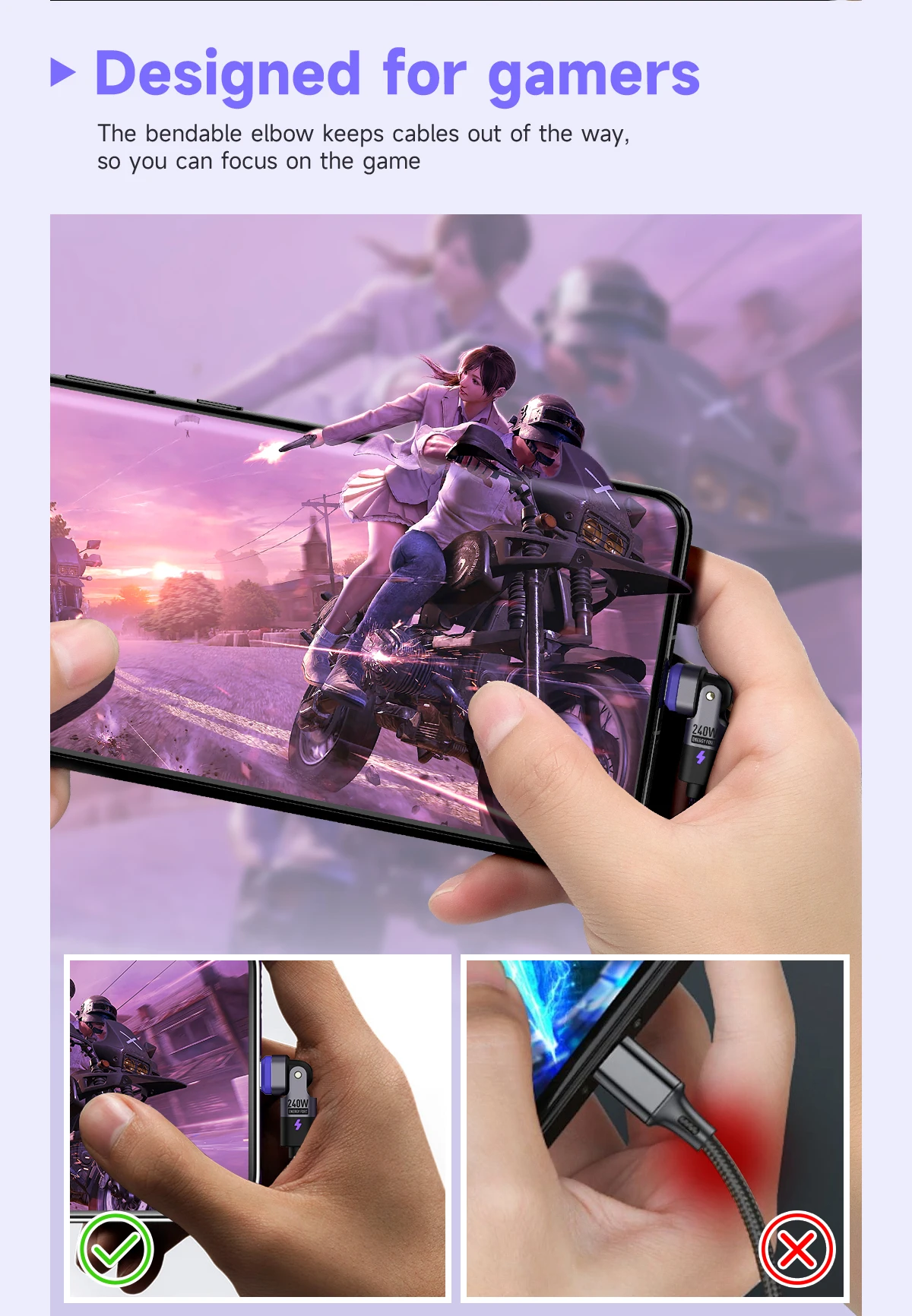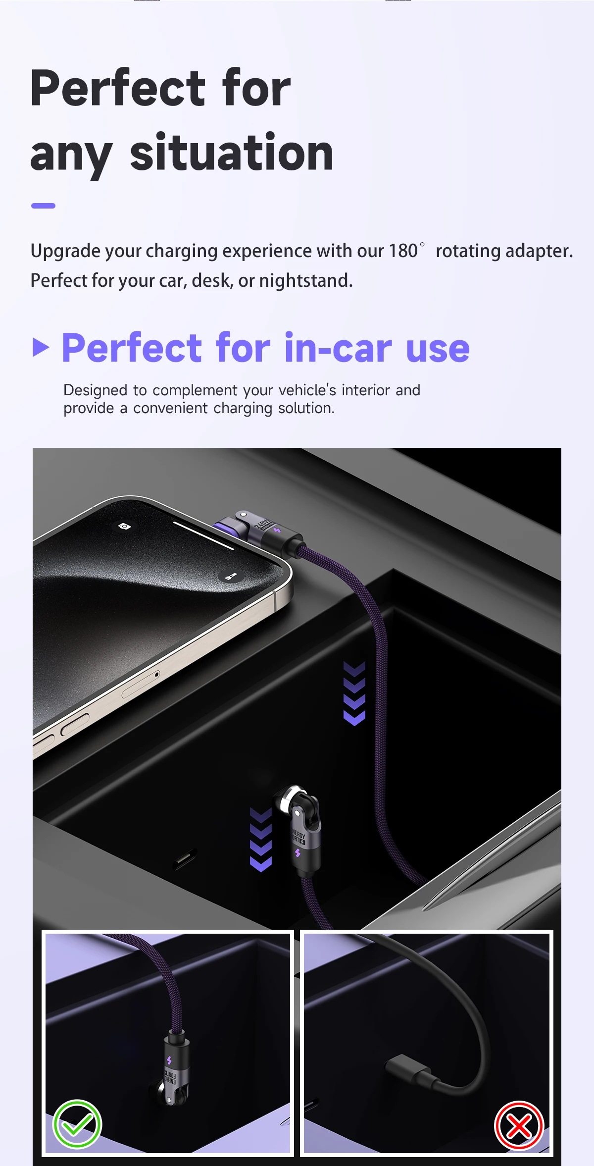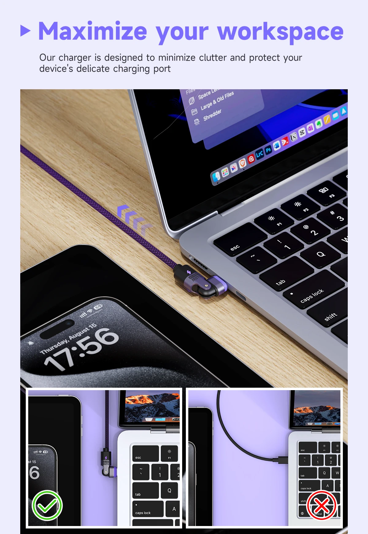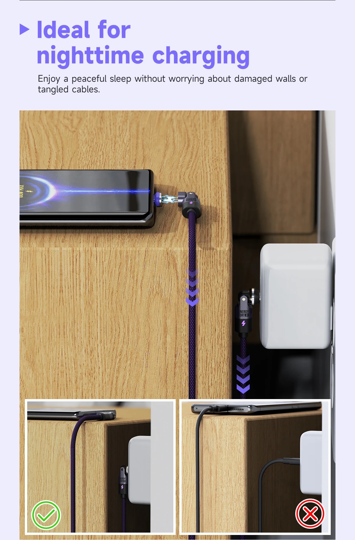 A 360° swivel plus 180° foldable joint lets you plug in at any angle. Perfect for desks, gaming setups, and bedside charging — it minimizes cable strain and protects your device’s charging port from wear and tear.