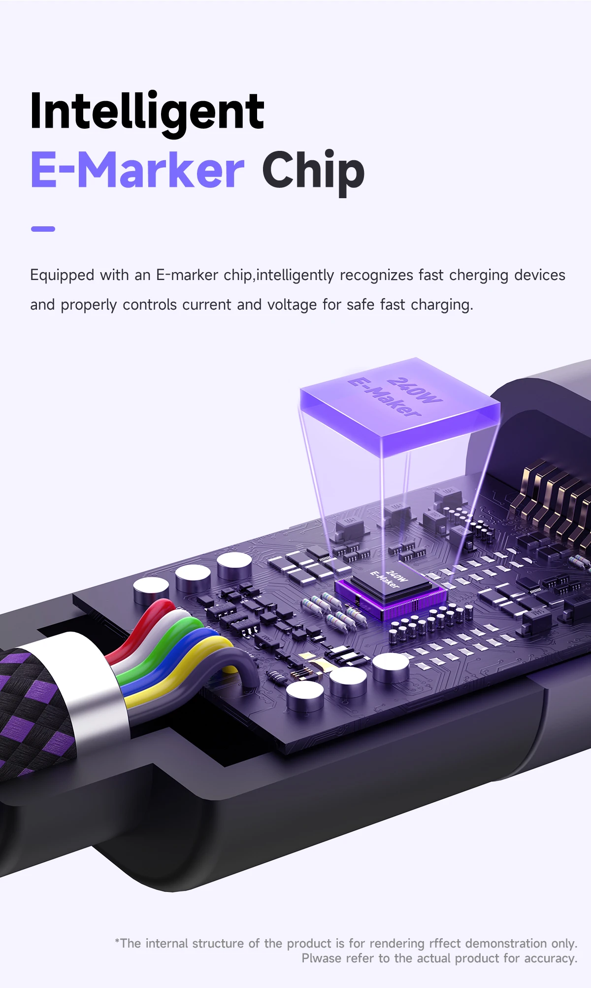 The integrated E-Marker chip automatically regulates voltage and current to deliver cooler, safer charging and optimal performance across all devices.